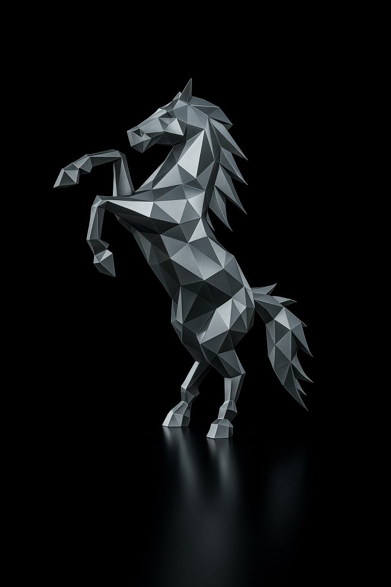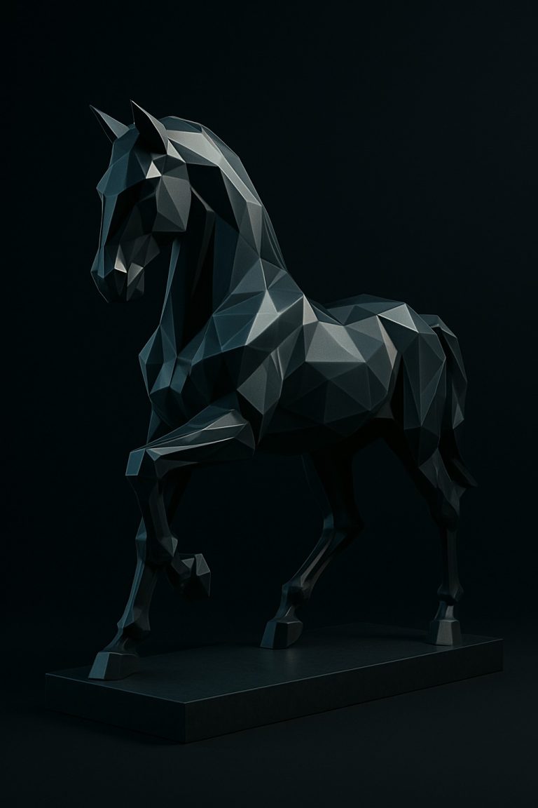 Una obra que transmite movimiento, fuerza y elegancia a través de una estética poligonal moderna. Su pose en trote firme y cuello erguido proyecta autoridad, dinamismo y conexión con la libertad. Esta pieza se convierte en un punto focal para cualquier entorno contemporáneo, desde espacios arquitectónicos exteriores hasta interiores de alto diseño.