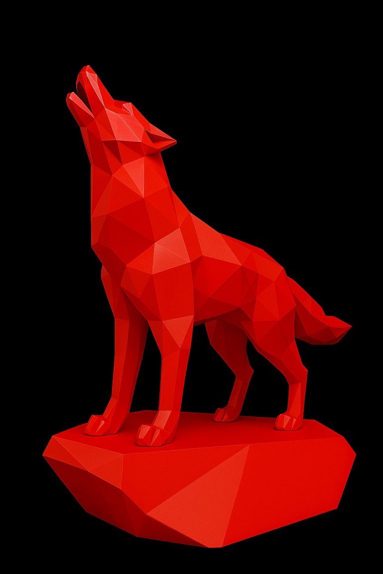 Captura al lobo en su expresión más simbólica: la conexión con su naturaleza salvaje, la llamada ancestral y el espíritu de la libertad. Su postura ergida, con el hocico elevado hacia el cielo, refleja fuerza, identidad y pertenencia. La estética poligonal refuerza su carácter moderno, haciendo de esta pieza un ícono visual imponente.