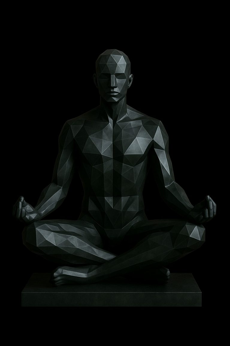 Una figura humana masculina en posición de meditación, con el cuerpo erguido y el rostro sereno, transmitiendo una profunda sensación de paz, introspección y equilibrio interior. El diseño geométrico y poligonal potencia el contraste entre fuerza física y calma mental, convirtiendo a esta obra en un ícono visual de la conexión entre cuerpo y mente.