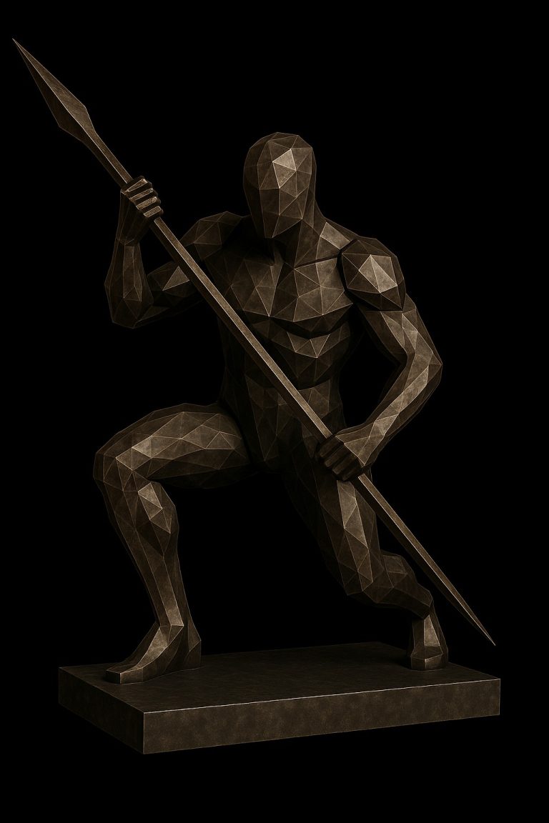 Representa a un guerrero en posición de vigilancia, con el cuerpo inclinado y la lanza firmemente sujeta en ambas manos. Su estética poligonal y facetas angulosas le confieren una presencia imponente, moderna y atemporal. Esta obra transmite fuerza, protección, resistencia y determinación.