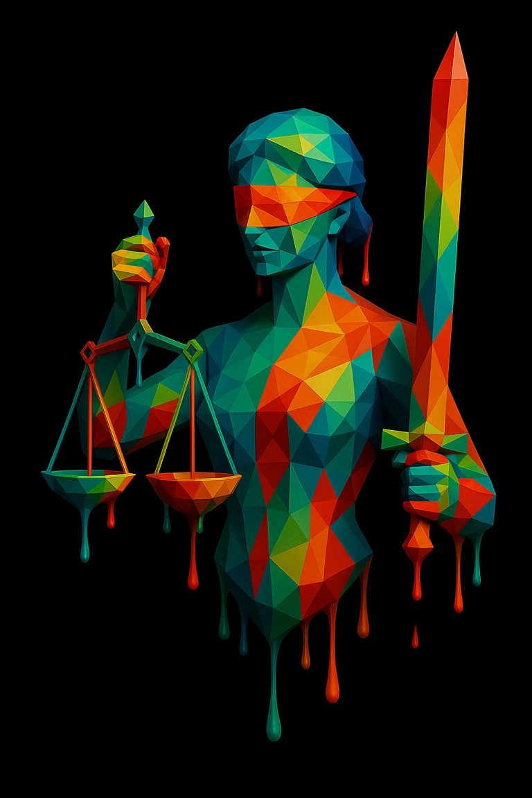 Esta impactante escultura reinterpretada de la clásica figura de la justicia combina geometría moderna con una expresión artística vibrante y conceptual. Representada con balanza, espada y venda, esta versión rompe con lo tradicional al incorporar un estilo poligonal de líneas anguladas y acabados tipo goteo, generando una pieza provocadora y visualmente poderosa.