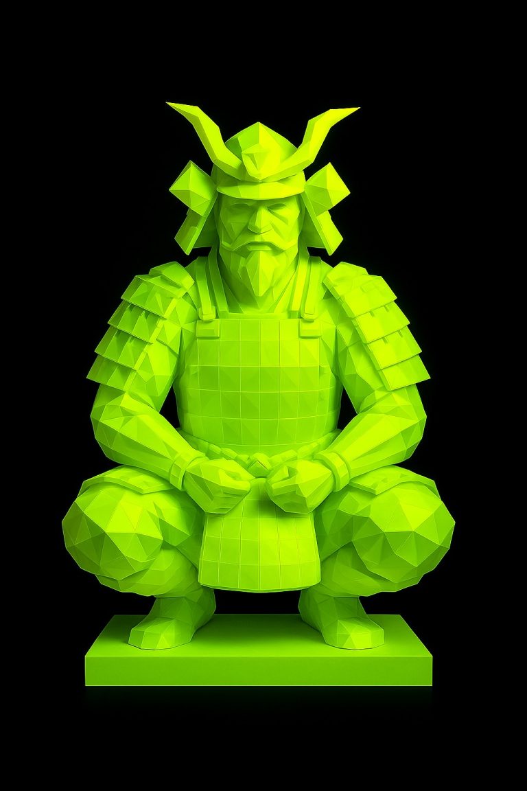Esta escultura representa a un samurái en posición de descanso y contemplación, con detalles poligonales que reflejan una estética moderna sin perder el carácter tradicional de la figura. El diseño transmite fuerza, sabiduría y serenidad, convirtiéndola en una pieza emblemática para espacios interiores o exteriores con personalidad.