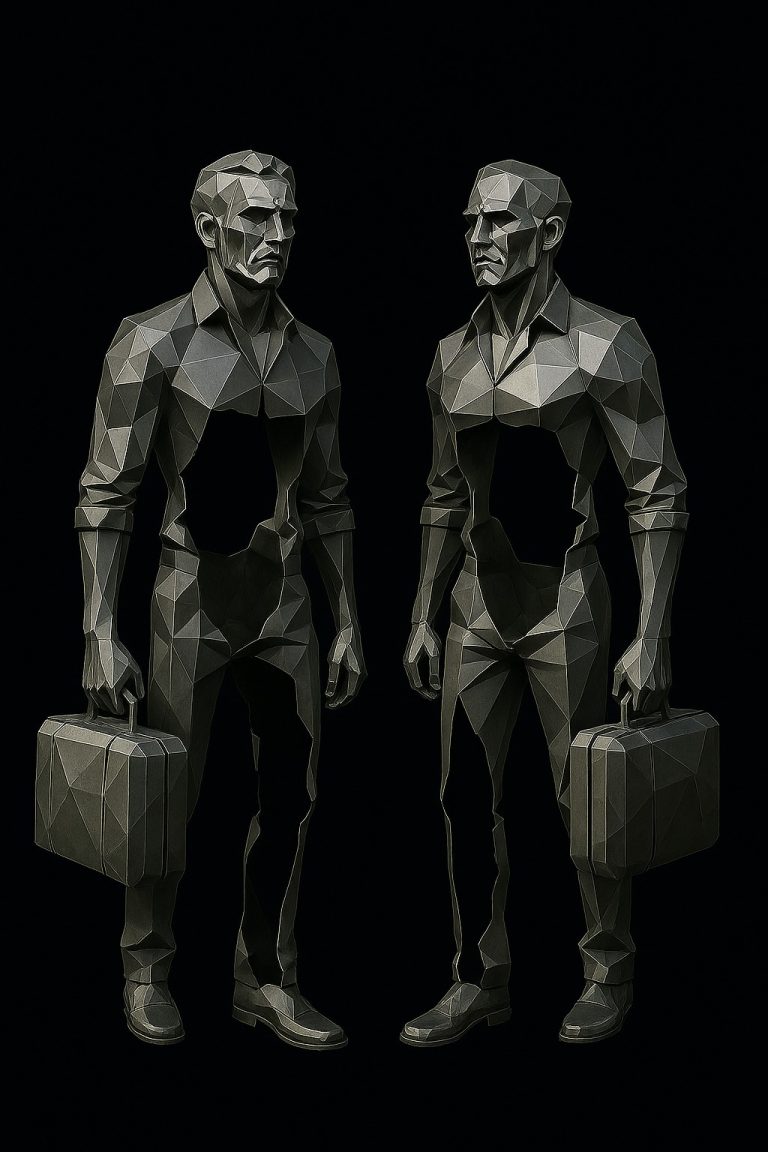 Esta escultura poligonal de estilo contemporáneo representa a un hombre de pie, con expresión firme y maletín en mano, evocando conceptos como el viaje, la decisión y la transformación personal. Su diseño facetado de líneas geométricas genera una estética moderna y poderosa, ideal para espacios públicos, corporativos o residencias de alto nivel.