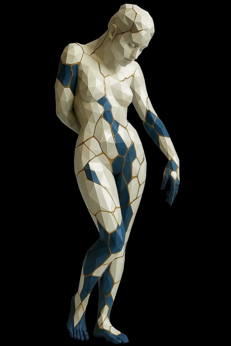 Representa una figura femenina en postura introspectiva y serena, con un cuerpo dividido en polígonos que simulan fracturas reconstruidas con precisión, inspiradas en la técnica japonesa del kintsugi (reparación con oro). Este diseño mezcla lo humano con lo abstracto, generando una poderosa narrativa sobre la belleza en la imperfección, la transformación y la vulnerabilidad reconstruida.
