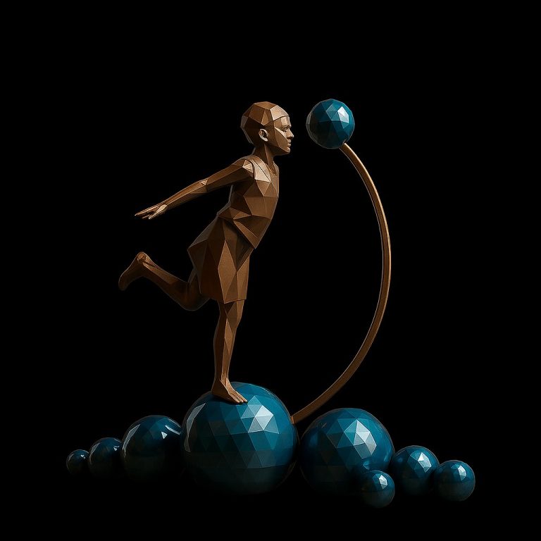 Es una escultura poligonal que representa a un niño en movimiento, suspendido con ligereza sobre una serie de esferas, alcanzando una figura superior en equilibrio. El diseño expresa la curiosidad, el juego, el descubrimiento y la libertad de la infancia, capturada con una estética moderna y emocional.