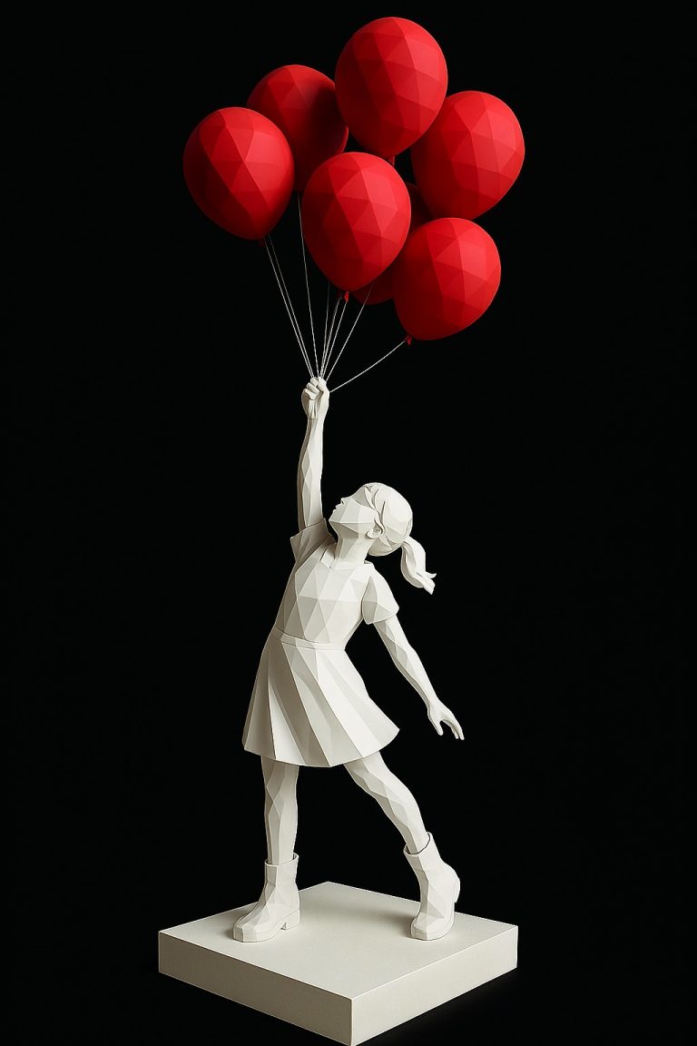 Captura la inocencia, esperanza y deseo de volar más allá de los límites. Esta escultura poligonal representa a una niña elevándose suavemente al sostener un racimo de globos, en un gesto de juego y anhelo de libertad. Su estética de líneas geométricas modernas se combina con un profundo simbolismo emocional, haciendo de esta pieza una obra ideal para espacios públicos, parques, plazas culturales o interiores de gran impacto visual.
