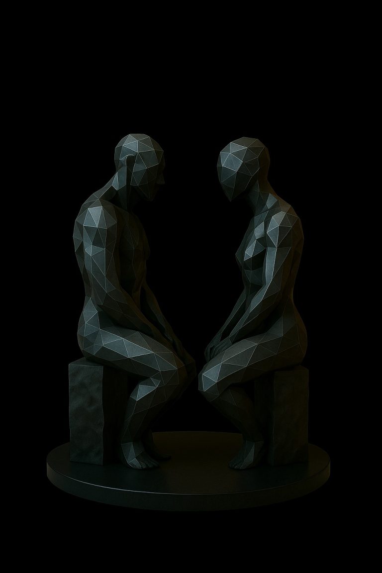 Representa a dos figuras humanas sentadas, frente a frente, en una postura de introspección, conexión o confrontación. Su diseño geométrico y poligonal refleja la esencia moderna de la forma humana, desprovista de rasgos, pero cargada de simbolismo. Esta escultura habla del diálogo interior, de la dualidad del ser o de la relación entre opuestos que se observan en silencio.