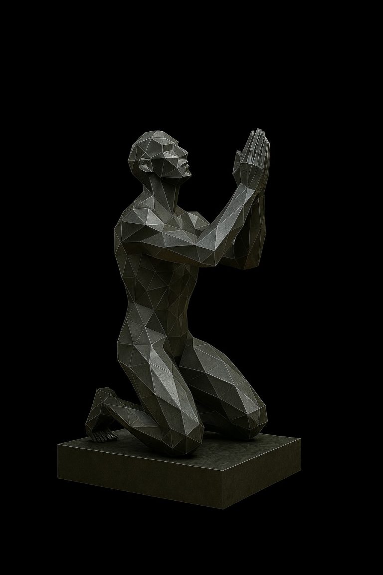 Es una escultura contemporánea que retrata a una figura humana de rodillas, con las manos juntas en actitud de plegaria o introspección. Su lenguaje visual poligonal, definido por líneas anguladas y volúmenes facetados, refleja fuerza emocional, vulnerabilidad y conexión espiritual.
