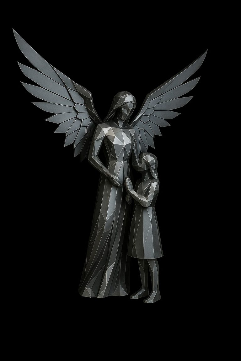 Representa una poderosa escena de protección y amor: un ángel con alas desplegadas protege con ternura a una niña. Su lenguaje poligonal genera una estética contemporánea cargada de simbolismo espiritual. La escultura transmite consuelo, esperanza, guía y presencia divina, siendo ideal para espacios que buscan reflejar valores de paz, memoria y protección.