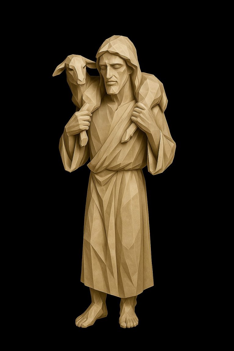Representa a una figura serena cargando una oveja sobre sus hombros, símbolo universal de cuidado, guía y compasión. Elaborada con una estética poligonal contemporánea, esta obra une tradición cristiana con arte moderno, siendo perfecta para espacios que buscan transmitir protección, fe y redención.