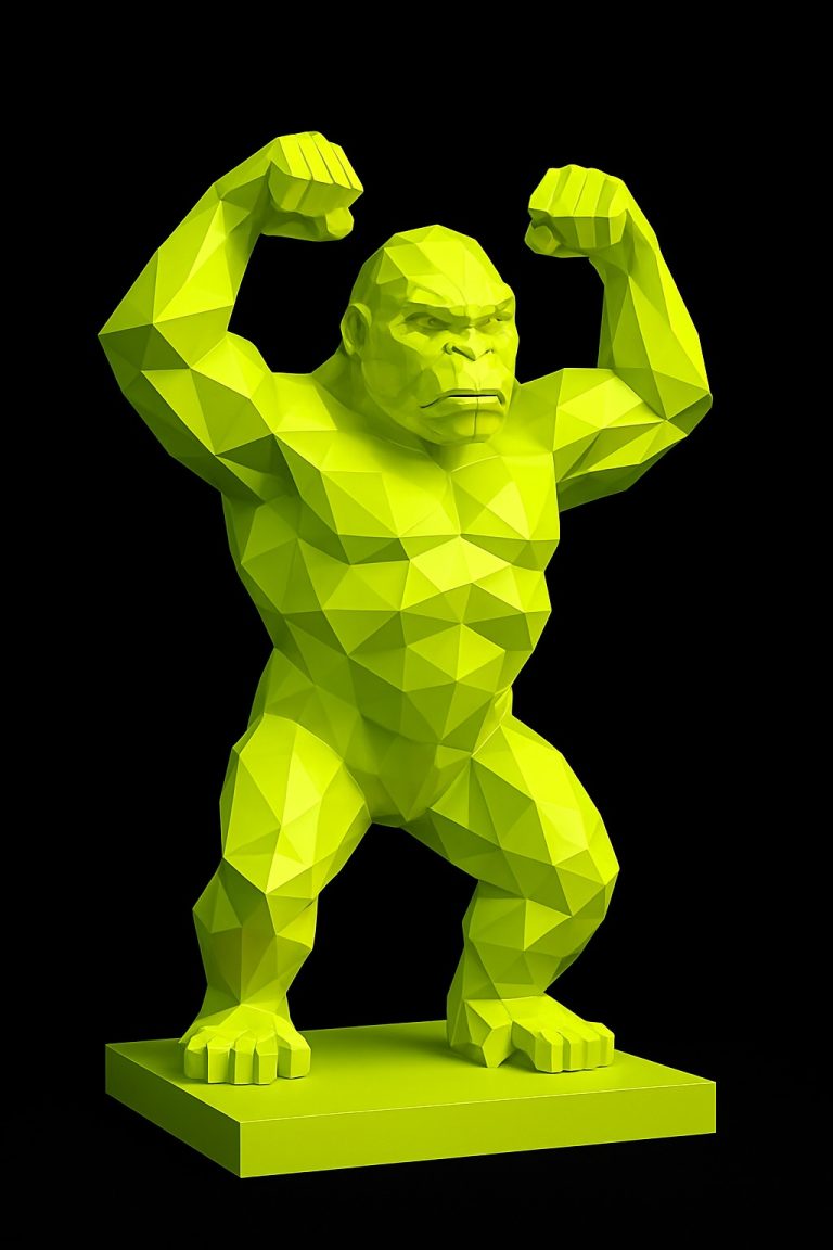 Esta imponente escultura poligonal representa a un gorila en postura desafiante, con ambos brazos en alto, símbolo de poder, protección y dominio. Su diseño facetado de estilo bajo-polígono proyecta fuerza visual y volumen escultórico, ideal para convertirse en punto focal en espacios modernos, urbanos o artísticos.