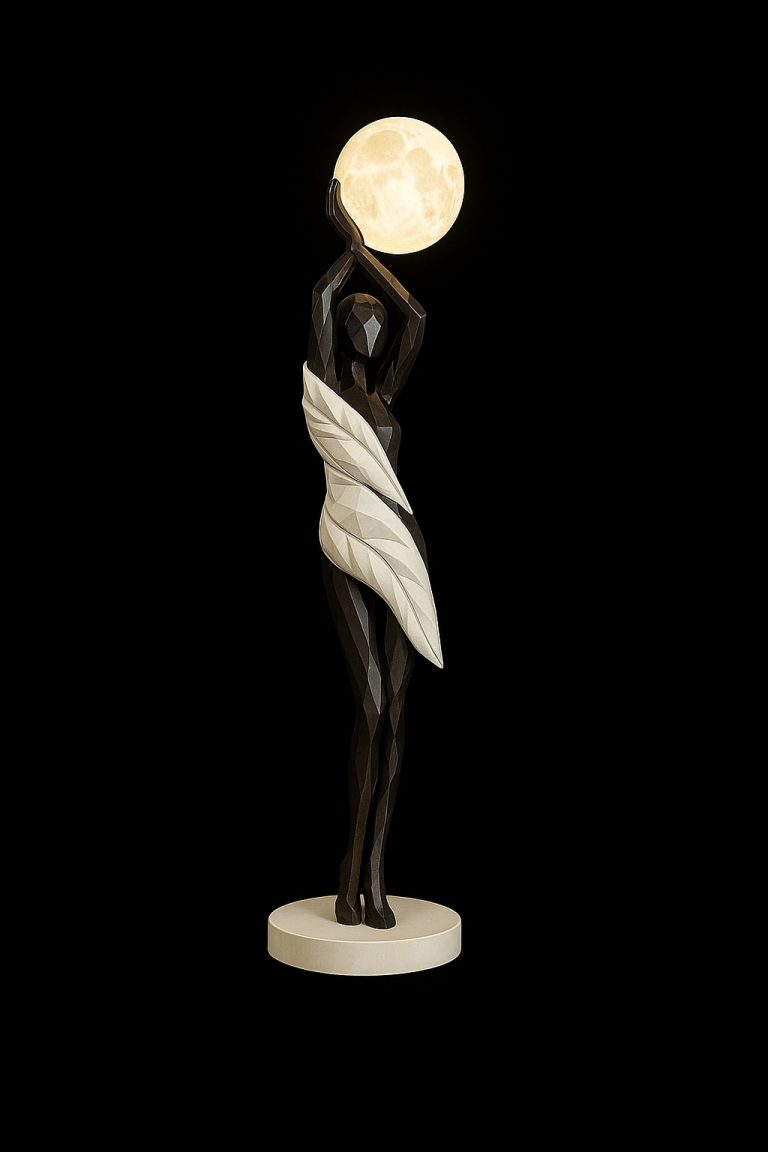 Es una escultura que representa a una figura femenina de pie, erguida y poderosa, sosteniendo la luna entre sus manos como símbolo de conexión con el universo, feminidad, energía y equilibrio. Su cuerpo estilizado de geometría poligonal, envuelto por formas que simulan hojas o pliegues naturales, eleva esta pieza a una expresión artística contemporánea y profundamente simbólica.