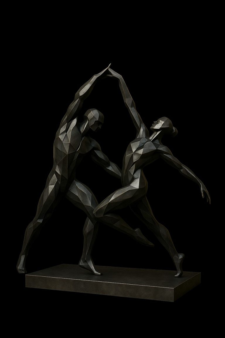 Es una escultura que representa a una pareja en plena sincronía, capturada en un instante coreográfico de equilibrio, fuerza y fluidez. La composición triangular y el estilo poligonal aportan dinamismo y modernidad, exaltando la belleza del movimiento humano, la conexión emocional y la armonía compartida.