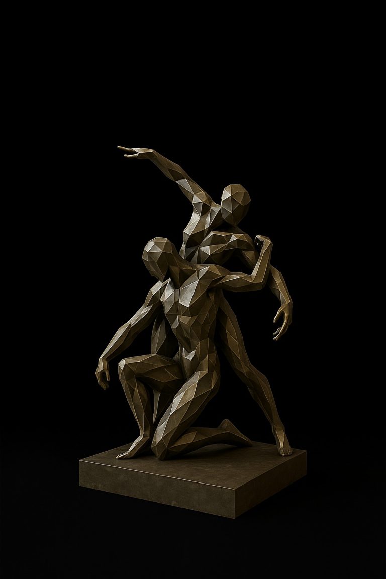 Representa la unión de dos figuras humanas en equilibrio emocional y físico. El lenguaje escultórico poligonal resalta las formas anatómicas con una estética contemporánea, capturando la conexión íntima, la confianza y la igualdad entre ambos cuerpos. Esta pieza transmite un mensaje universal de amor, respeto, unidad y humanidad compartida.