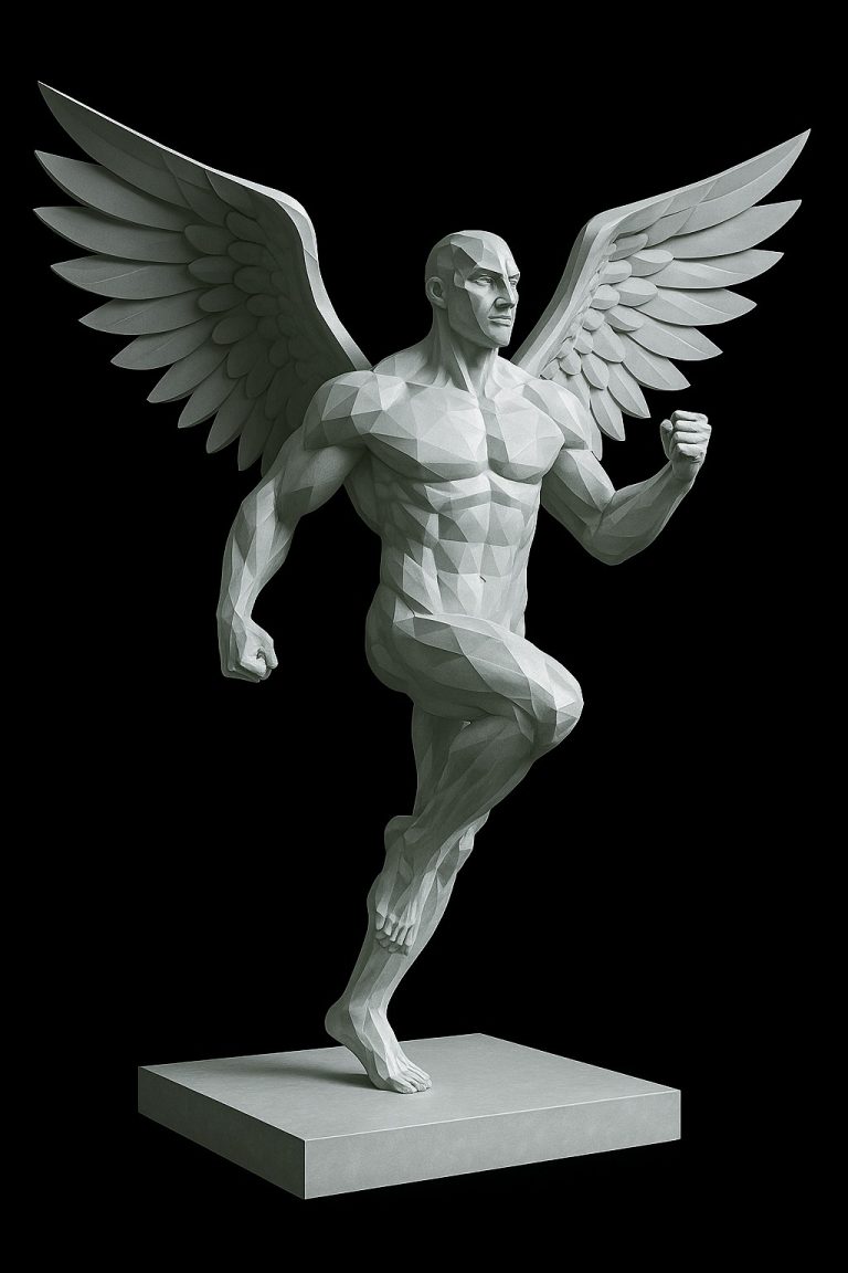 Una figura masculina con alas extendidas, en un momento de impulso ascendente. Su postura enérgica, combinada con la precisión geométrica del diseño poligonal, transmite poder, espiritualidad, libertad y trascendencia. Las alas, cuidadosamente segmentadas, refuerzan el simbolismo de elevación física y espiritual.