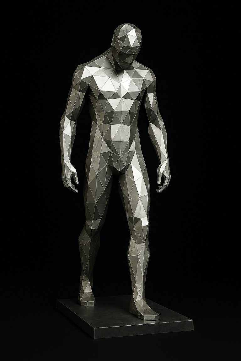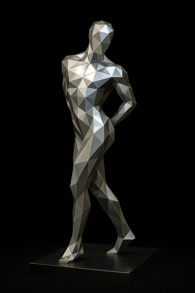 La belleza abstracta del cuerpo masculino en una pose elegante, relajada y segura. Su diseño geométrico facetado resalta los volúmenes anatómicos con una estética vanguardista, convirtiéndola en una pieza escultórica ideal para espacios modernos y ambientes de contemplación artística. Transmite equilibrio, sobriedad y presencia sin necesidad de gestos exagerados.